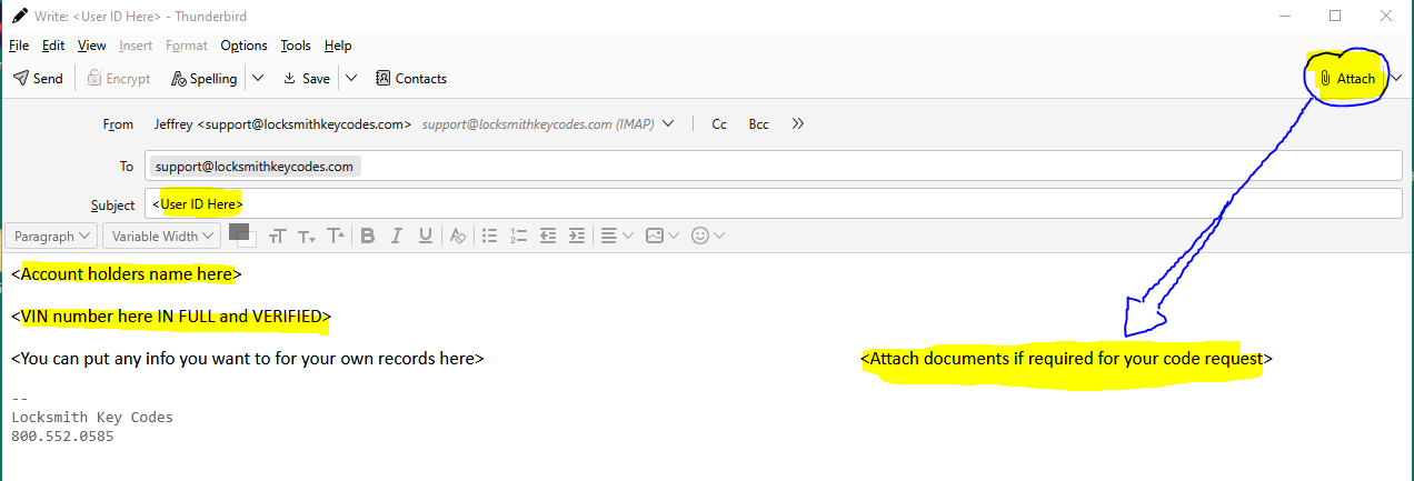 Using the example website above you can see 5 highlighted areas. It is YOUR responsibility to know before you request a code how long a code takes to get back, how much it costs, and if that vehicle code CAN be pulled at all. Isuzu, GM, 2016+ Ford, and our cheaper Toyota/ Lexus option all require documentation for us to get you a code. You need to know that, have them attached to the email, and they must be valid and all match. Only send email requests to support@locksmithkeycodes.com. The subject line of the email should ONLY contain your user ID number (it is the “key” to your account). In the body you can put anything you want but what we should see first is the account holders name (NOT YOUR BUSINESS NAME!) and ALWAYS a full typed VIN number. It must be valid and verified. Whatever else you put under the VIN is up to you.